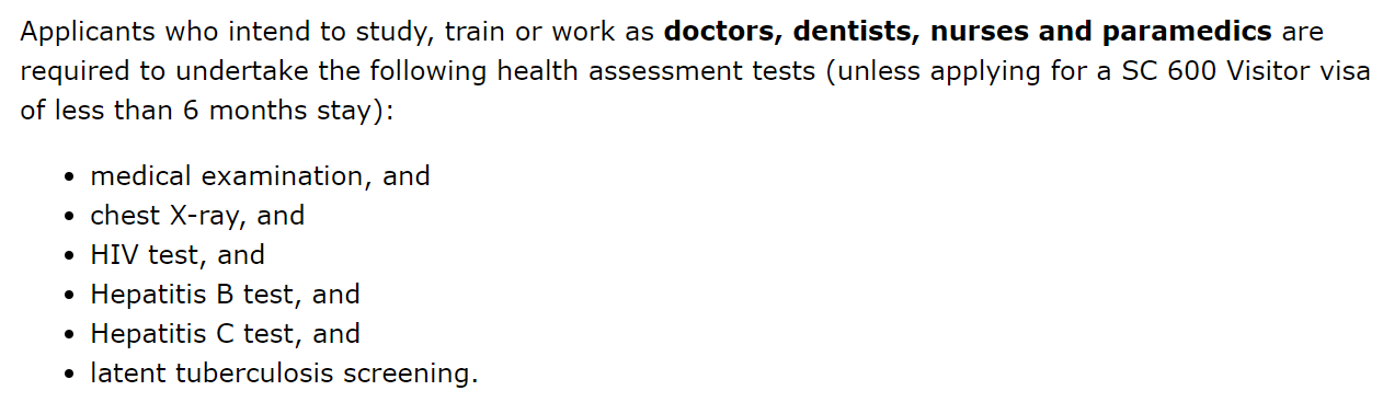 在澳洲读书,工作或培训的医生,牙医,护士和护理人员,且签证长于6个月的,签证体检时需要完成以下6项检查。